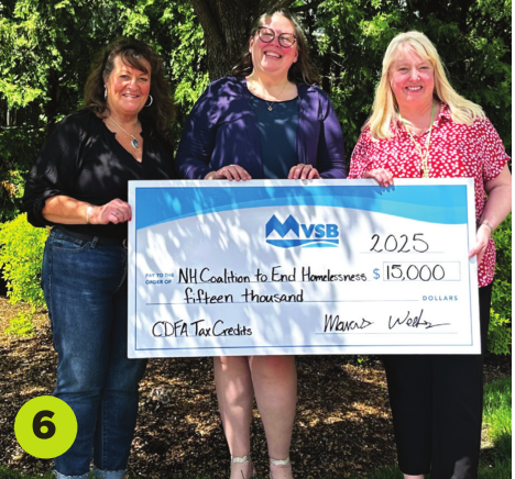 6. Meredith Village Savings Bank (MVSB) purchased $15,000 in tax credits through the NH Community Development Finance Authority to support the NH Coalition to End Homelessness’ (NHCEH) education efforts, including their Granite Leader programming and Regional Roundtables. Pictured, from left: Jennifer Stone, MVSB branch services supervisor; Jennifer Chisholm, NHCEH Executive Director; and Sue Dagostino, MVSB branch and business development manager.