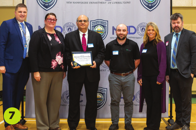 7. White Mountains Community College (WMCC) received the Community Partner of the Year award from the NH Department of Corrections (NHDOC) for its work with the Northern New Hampshire Correctional Facility to provide opportunities for students to earn an associate degree through the college. The program’s goal is to prepare participants for life and employment postrelease, and is centered on rehabilitation, reducing recidivism and enhancing facility safety. Pictured, from left: NHDOC Assistant Commissioner Paul Raymond, NHDOC former Commissioner Helen Hanks, WMCC President Sarmad Saman, WMCC Coordinator of Educational Partnerships & Access Ryan Richard, NHDOC Laura Hardwick and NHDOC Nick Duffy.