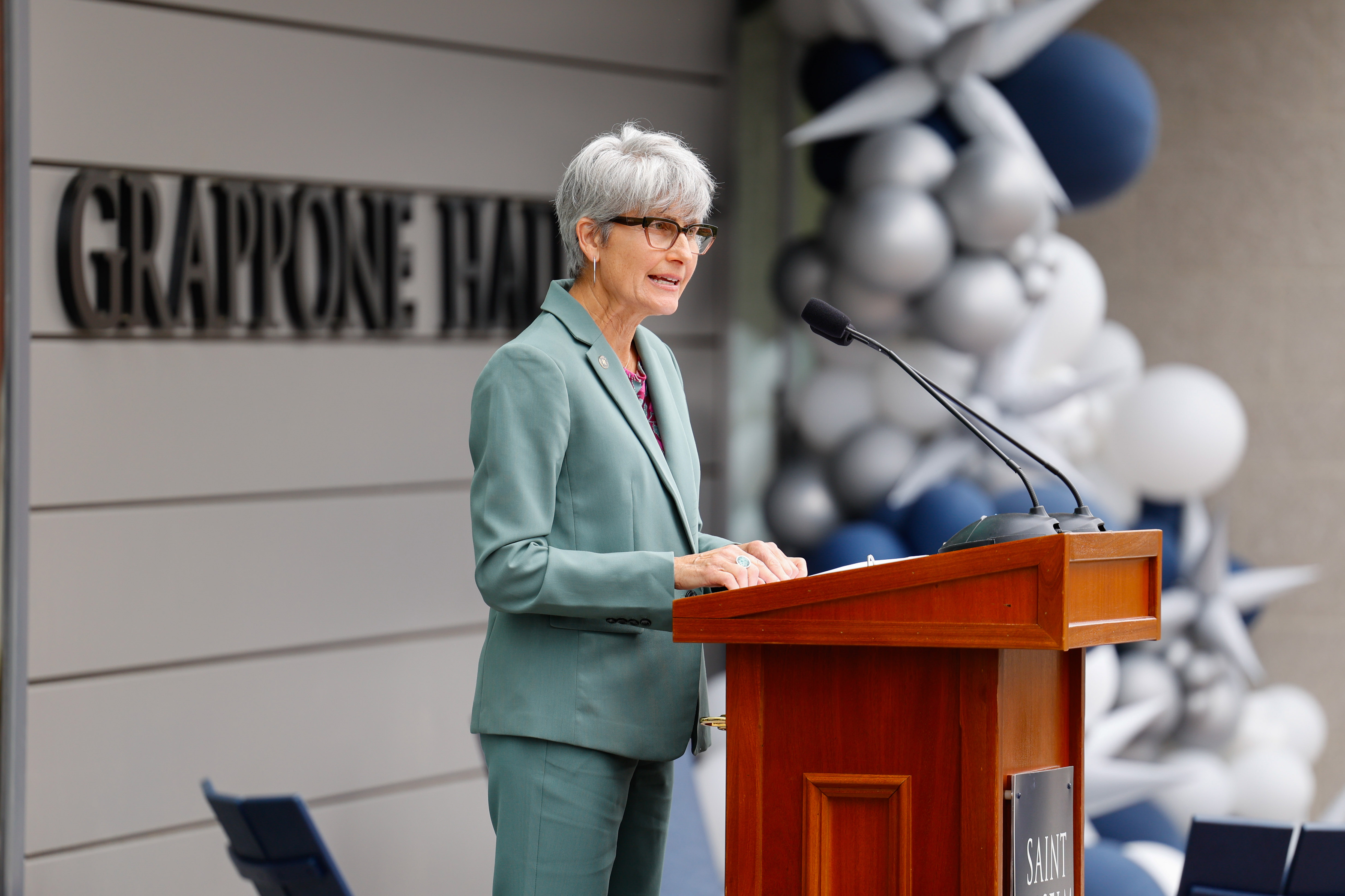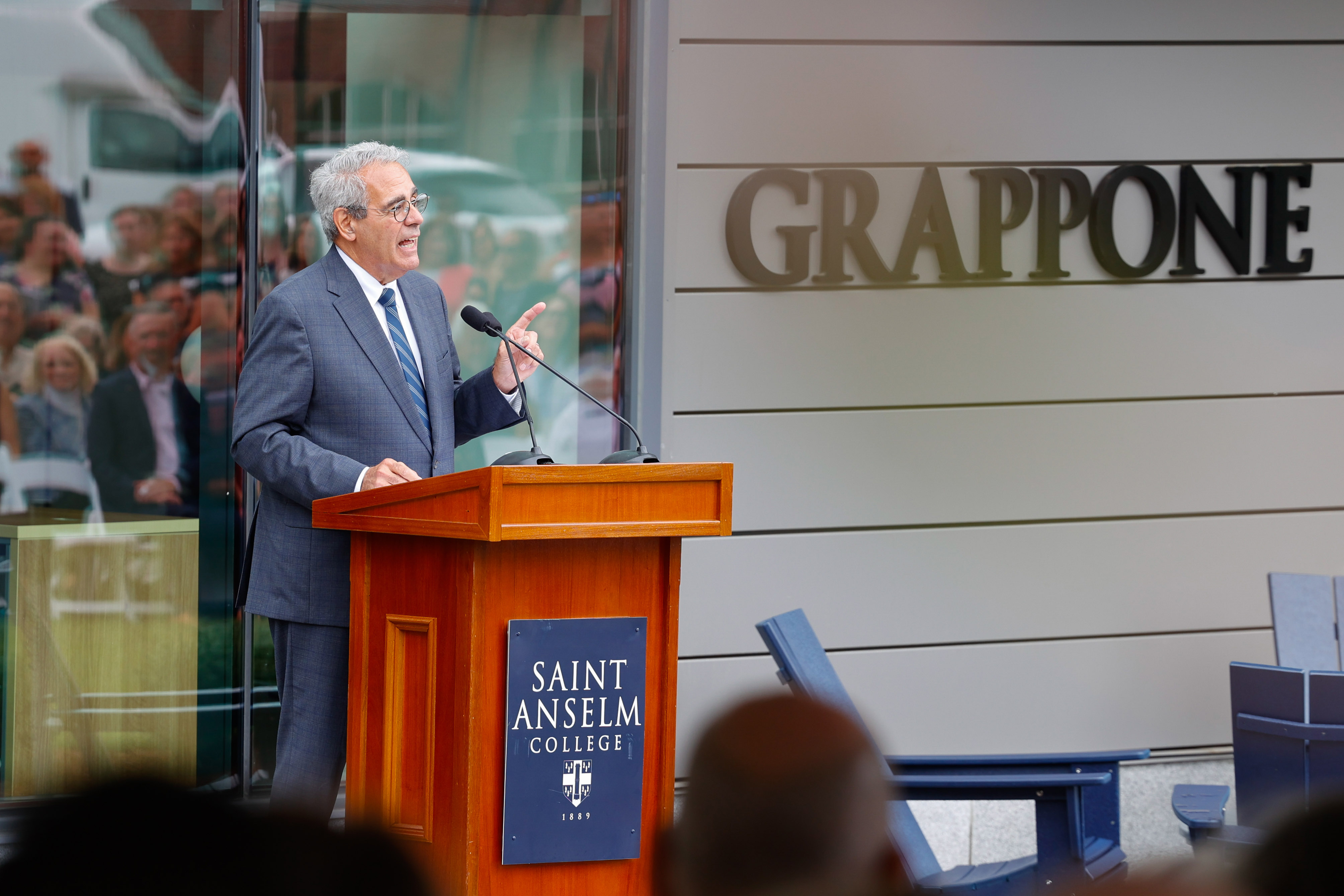 Joseph Favazza, president of Saint Anselm College, addresses a group Sept. 5 gathered to celebrate the school’s new nursing building.