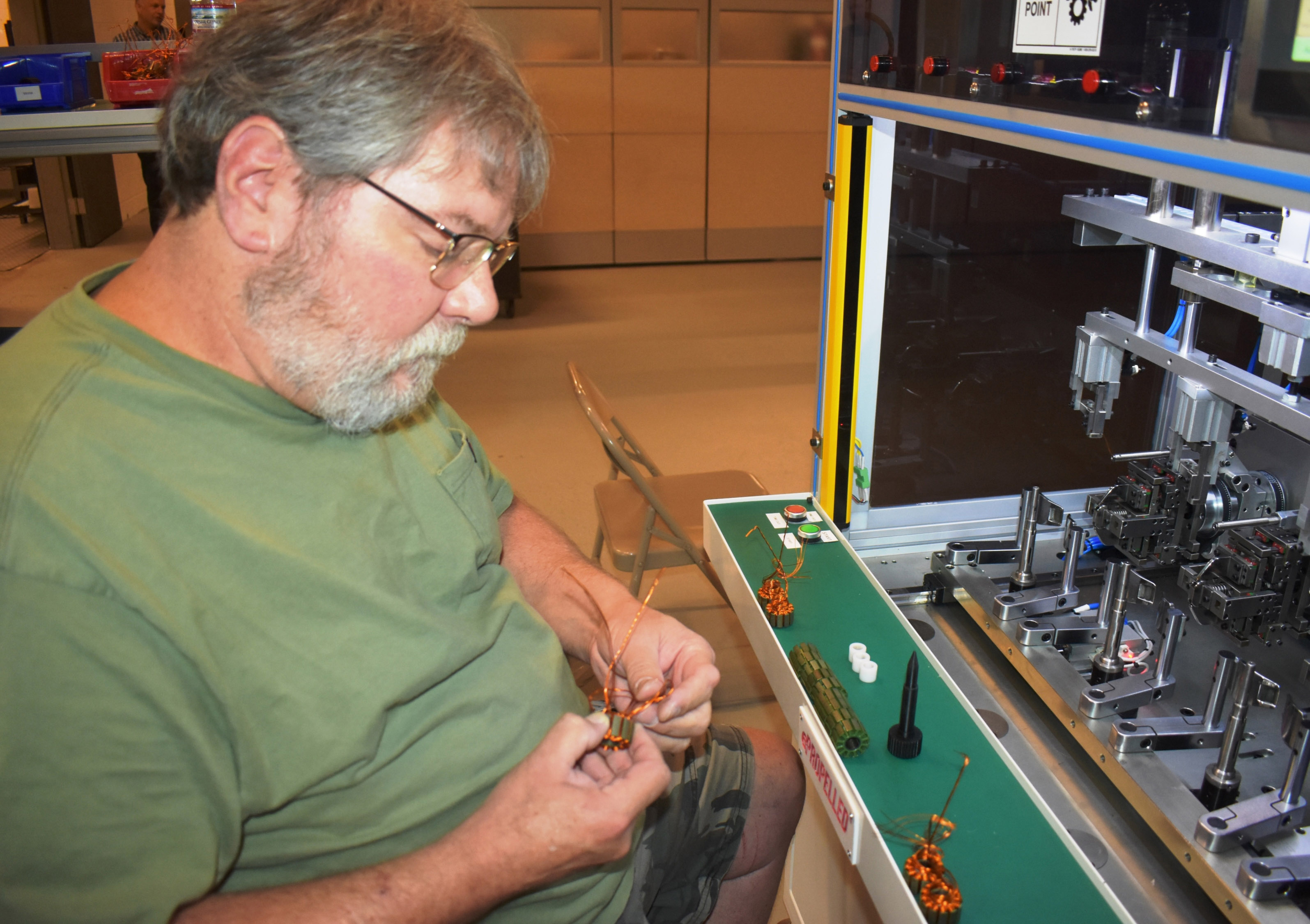 George Smith, an employee of ePropelled, works on a wire winding machine to make a component for drone motors. (Photo by John Koziol)
