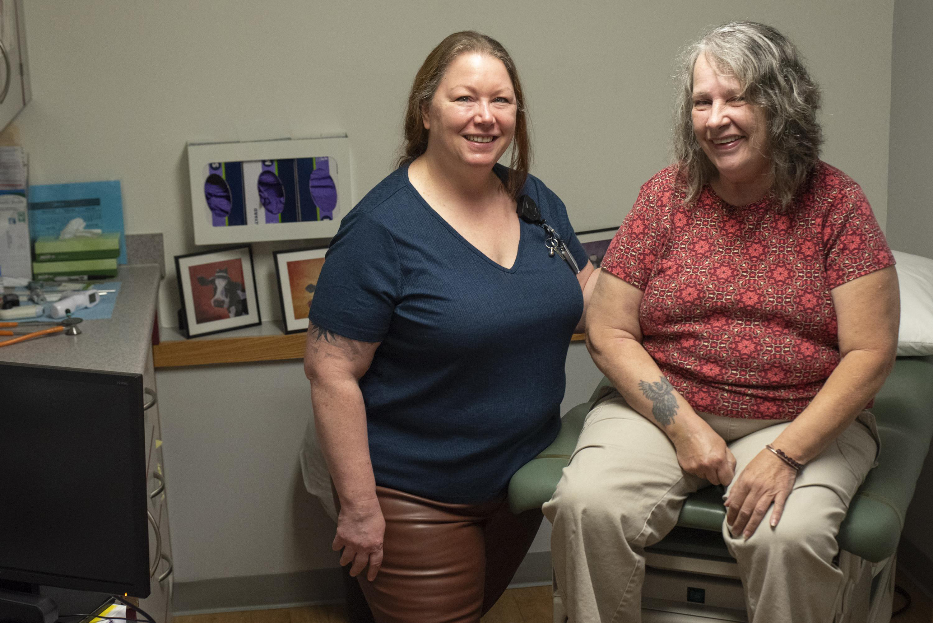 Physician assistant Maryanne Christiansen with patient Kimberly Mulroney, 61, at the Coos County Family Health Service clinic in Berlin, NH, on Thursday, Sept. 18, 2025. Mulroney has been a longtime patient with the health clinic, and comes in regularly for primary care appointments.