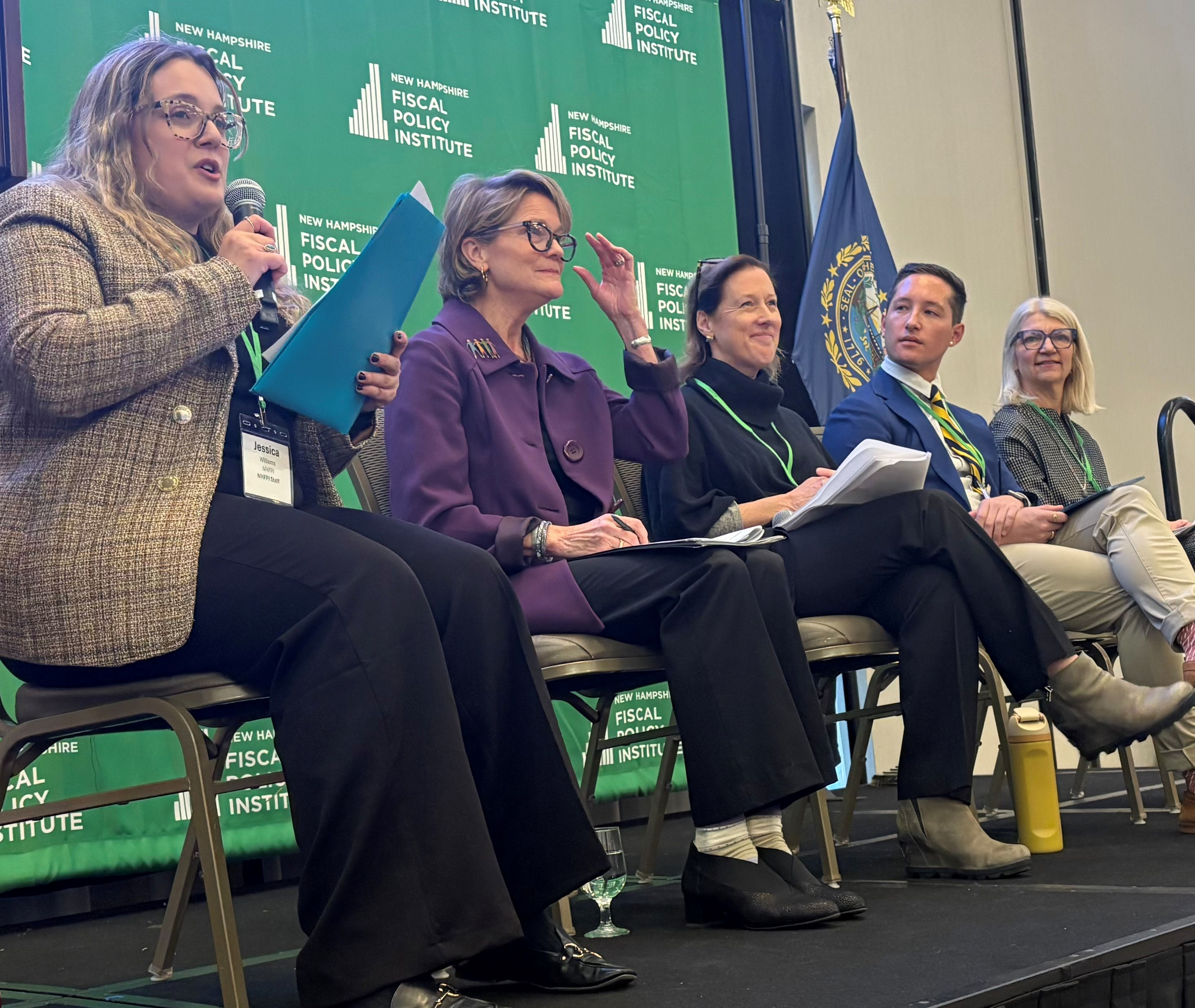 The rising cost of health care was included among the topics discussed at the Oct. 25 conference held by the New Hampshire Fiscal Policy Institute. Panelists on this topic included, from left, moderator Jessica Williams from NHFPI, Lucy Hodder from the UNH Franklin Pierce School of Law, Deborah Fournier from UNH’s Institute for Health Policy & Practice, Kirk Williamson from the Green Mountain Care Board, and Jennifer Frizzell the NH Health Cost Initiative.