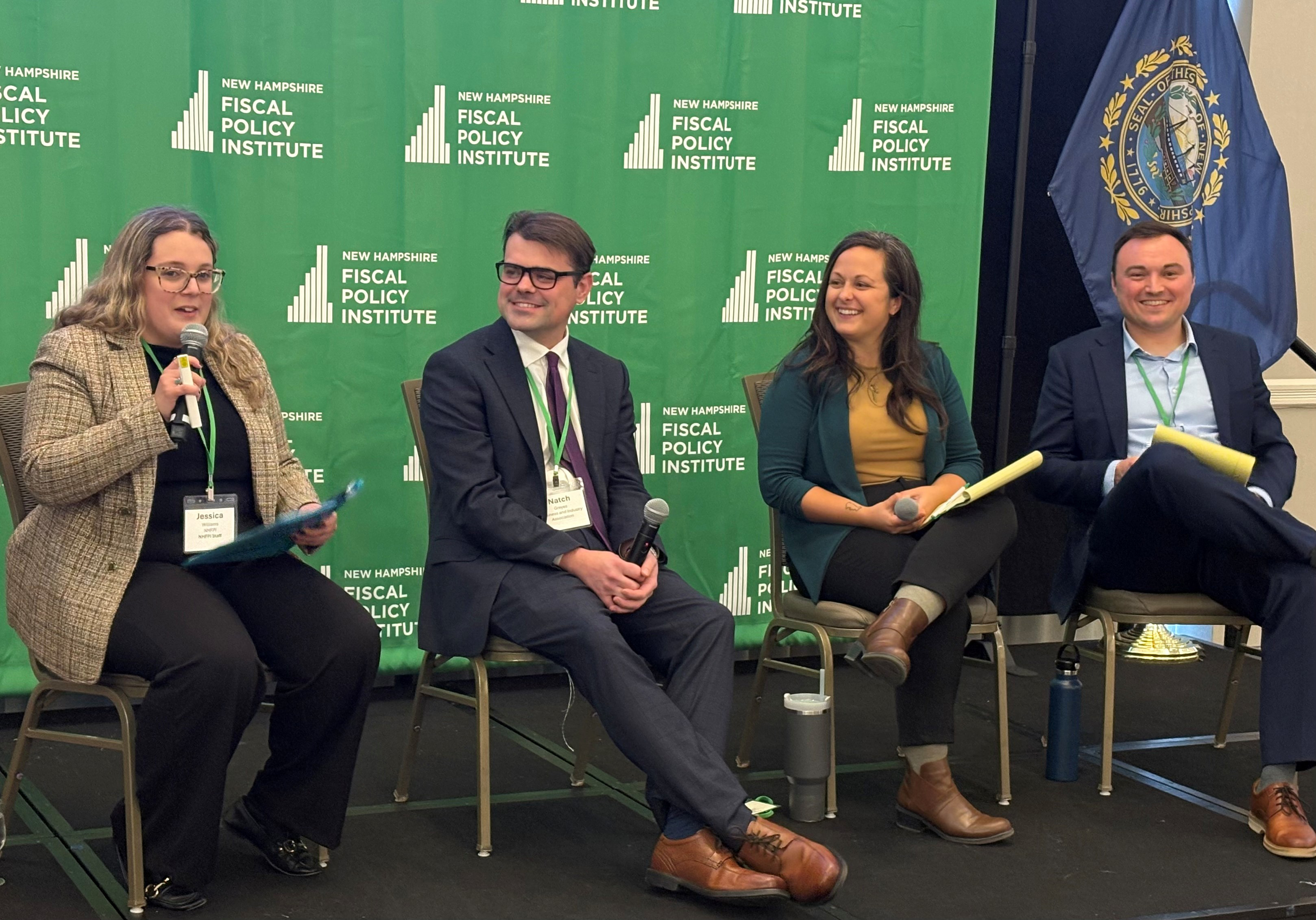 The biggest factor among the cost challenges facing New Hampshire is housing, as discussed by a panel at the NH Fiscal Policy Institute conference on Oct. 25. Panelists included, from left, moderator Jessica Williams from NHFPI, Natch Greyes from the NH Business and Industry Association, Sarah Wrightsman from New Hampshire Housing, and Nick Taylor from Housing Action NH.