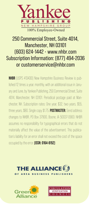 NEW HAMPSHIRE GROUP 100% Employee-Owned 250 Commercial Street, Suite 4014, Manchester, NH 03101 (603) 624-1442 • www.nhbr.com Subscription Information: (877) 494-2036 or customerservice@nhbr.com NHBR (USPS 413430) New Hampshire Business Review is published 12 times a year, monthly, with an additional issue in January and June, by Yankee Publishing, 250 Commercial Street, Suite 4014, Manchester, NH 03101. Periodical postage paid at Manchester, NH. Subscription rates: One year, $32, two years, $55, three years, $80. Single copy $1.75. POSTMASTER: Send address changes to NHBR, PO Box 37900, Boone, IA 50037-0900. NHBR assumes no responsibility for typographical errors that do not materially affect the value of the advertisement. This publication’s liability for an error shall not exceed the cost of the space occupied by the error. (ISSN: 0164-8152) See also