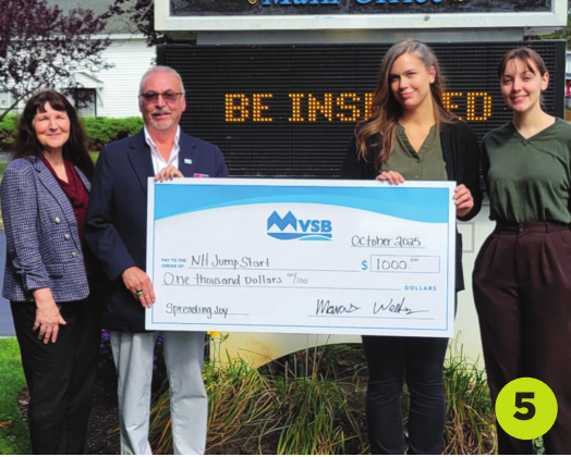 5. In October, Meredith Village Savings Bank (MVSB) participated in #NHBanksGiveBack, which is organized annually by the NH Bankers Association. MVSB celebrates supporting local towns through community service and financial support. NH Jump$tart helps improve the personal financial education of NH students. From left are MVSB Regional Vice President Cathy Sleeper; NH Jump$tart Senior Director of Education Dan Hebert, MVSB Teller Supervisor Lauren Reddy, and MVSB Branch Services Supervisor Joy Roberts.