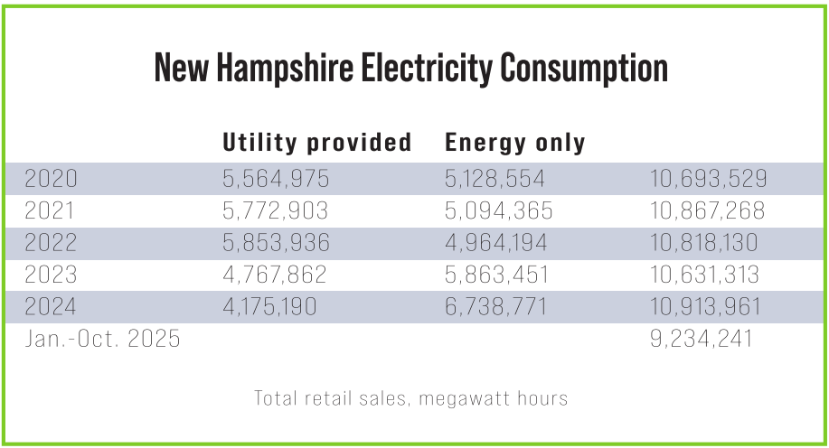 The total megawatt-hours of electricity sold in the Granite State has grown by only 2% over those five years, according to data compiled by the U.S. Energy Information Administration.