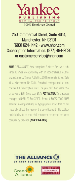NHBR (USPS 413430) New Hampshire Business Review is published 12 times a year, monthly, with an additional issue in January and June, by Yankee Publishing, 250 Commercial Street, Suite 4014, Manchester, NH 03101. Periodical postage paid at Manchester, NH. Subscription rates: One year, $32, two years, $55, three years, $80. Single copy $1.75. POSTMASTER: Send address changes to NHBR, PO Box 37900, Boone, IA 50037-0900. NHBR assumes no responsibility for typographical errors that do not materially affect the value of the advertisement. This publication’s liability for an error shall not exceed the cost of the space occupied by the error. (ISSN: 0164-8152)
