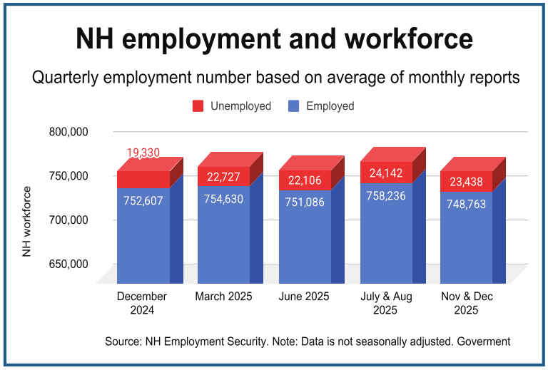 The average overall size of the New Hampshire workforce, which includes both workers and people looking for work, remained stable last year. The workforce comprised 772,201 people in the final quarter of 2025, about 250 more than the same period in 2024.
