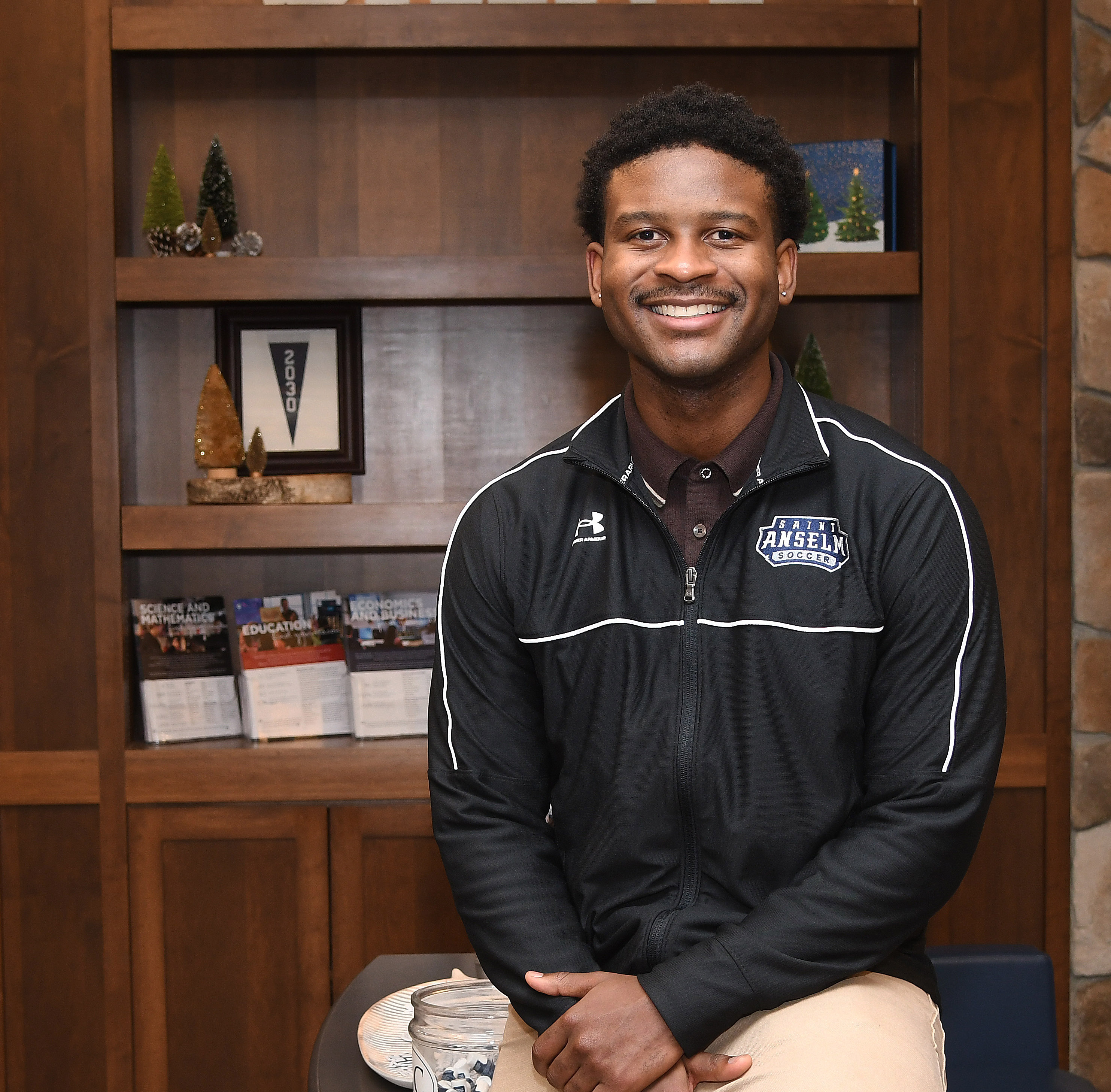 Samuel Assantha of Manchester, seen here at St. Anselm College’s Savard Welcome Center, is a senior seeking a bachelor’s degree in nursing from the Jean School.