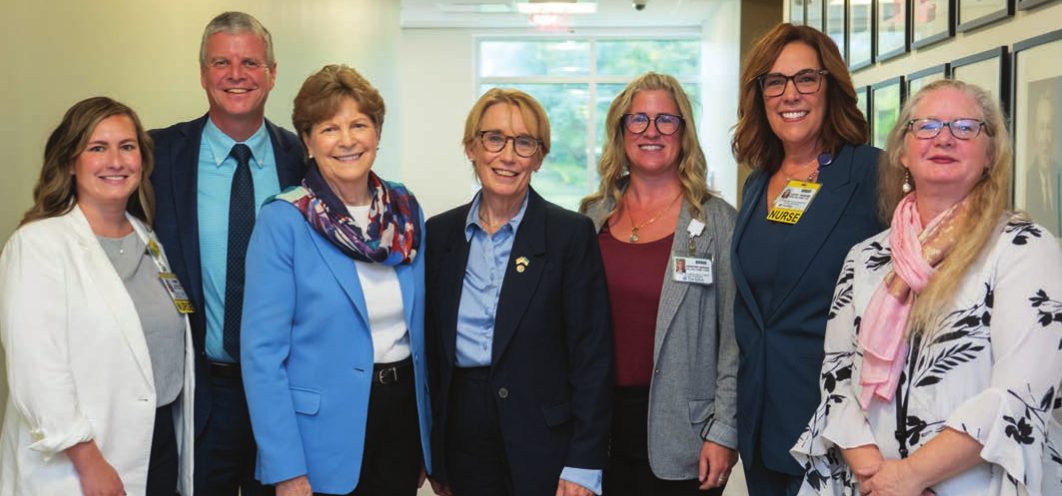 From left, Workforce Development Specialist & Granite State PARTNERS Project Manager, Sarah Vlasich, BSN, RN, CMSRN; President and Chief Operating Officer, Elliot Health System, Dr. Greg Baxter; U.S. Sen. Jeanne Shaheen; U.S. Sen. Maggie Hassan; Chief Nursing Executive and Senior Vice President, Patient Care Services, Martha Dodge, RN, MS, RN, CENP, CPPS; Director of Workforce Development & Experience, Becky Marden, RN, MSN, CNML, CPC; Retention Specialist, Vanessa Rashid.