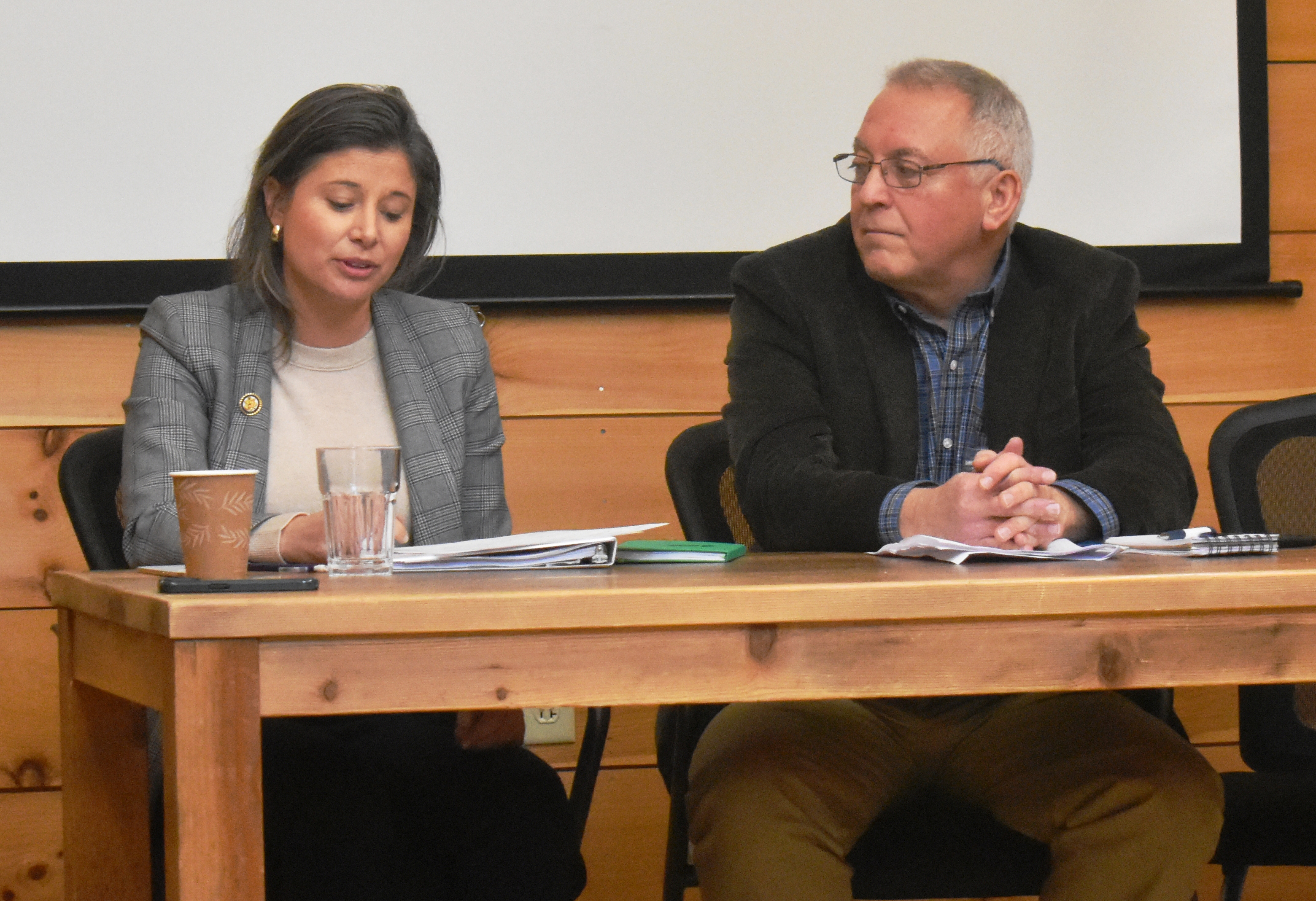 U.S. Rep. Maggie Goodlander talks about her efforts in Washington to support the outdoor industry at the second Grounded Growth forum on Feb. 18 at W. S. Badger in Gilsum. At right, Mike Cote, editor, NH Business Review.