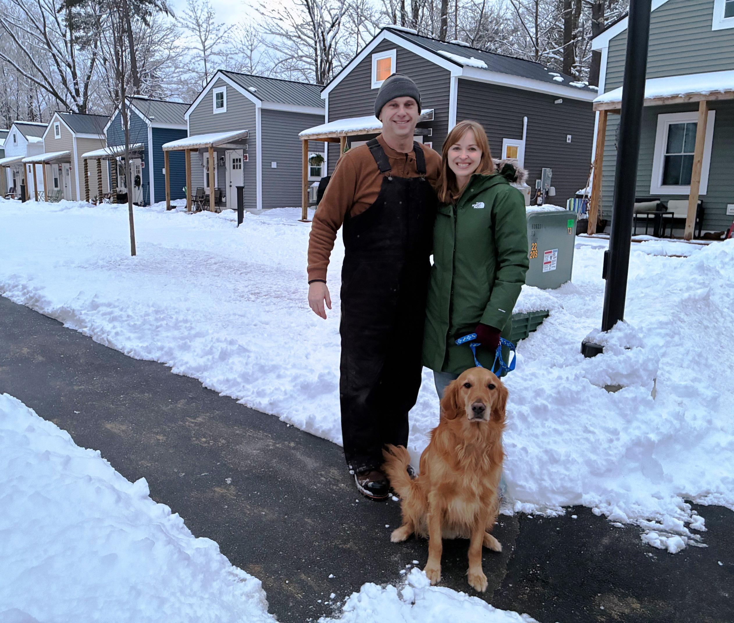 Maggie and John Randolph, joined by Hugh, their golden retriever, pose for a recent photo at The Cottages at Back River Road in Dover. The Randolphs built, own and operate the 44 small-house rental units at the site. (Photo by John Koziol)