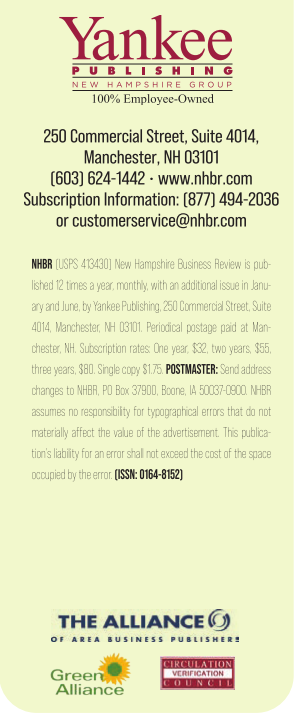 NHBR (USPS 413430) New Hampshire Business Review is published 12 times a year, monthly, with an additional issue in January and June, by Yankee Publishing, 250 Commercial Street, Suite 4014, Manchester, NH 03101. Periodical postage paid at Manchester, NH. Subscription rates: One year, $32, two years, $55, three years, $80. Single copy $1.75. POSTMASTER: Send address changes to NHBR, PO Box 37900, Boone, IA 50037-0900. NHBR assumes no responsibility for typographical errors that do not materially affect the value of the advertisement. This publication’s liability for an error shall not exceed the cost of the space occupied by the error. (ISSN: 0164-8152)
