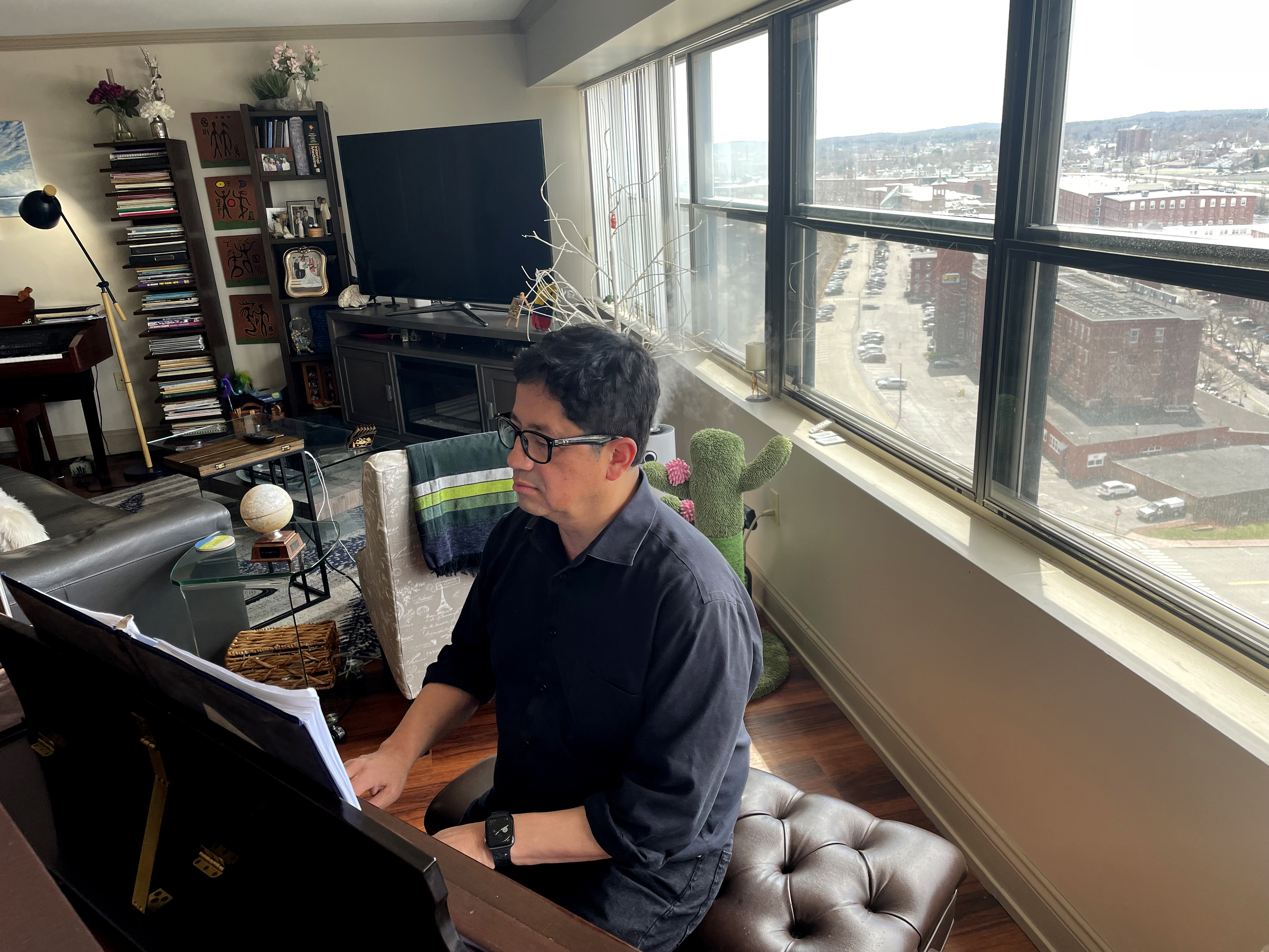 Armando Lopez works in his apartment on the 13th floor of the Wall Street Tower in Manchester in 2024. In a recent forecast presented to the Greater Manchester Chamber, economist Brian Gottlob touted the city’s growing supply of rental housing as a factor in its economic growth.