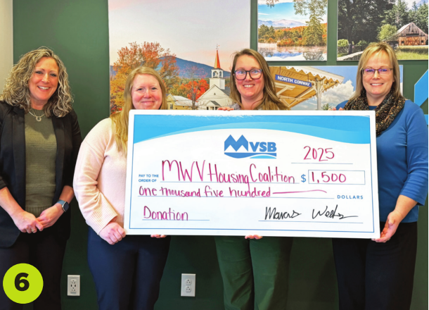 6. Meredith Village Savings Bank announced its support for the Mount Washington Valley Housing Coalition with a $1,500 donation, continuing its support for housing challenges in the region. From left are Jessica Ruel, MVSB AVP branch and business development manager; Brittany Hodge, MVSB mortgage loan officer; Sara Butterfield, MWVHC executive director; and Lori Cote, MVSB VP commercial loan officer.